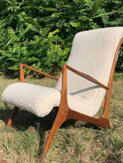 Couverture de cette paire de fauteuils avec un beau tissu bouclette de chez Pierre Frey.